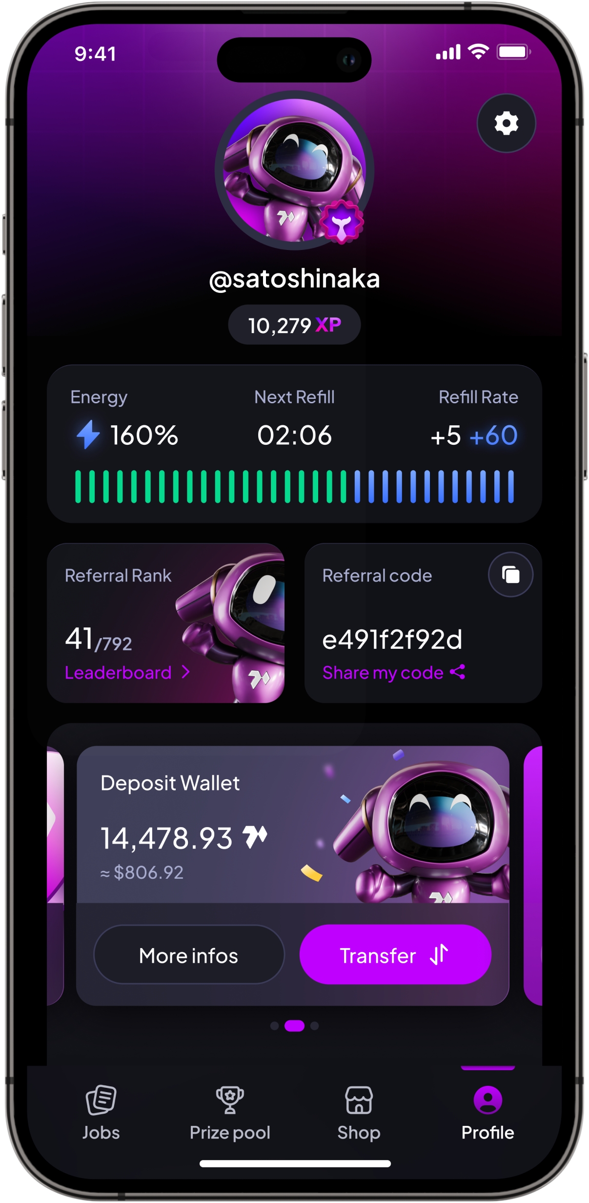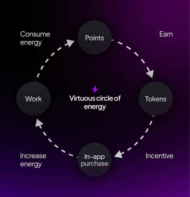 Users want to maximize their profit and therefore the number of tokens won. Based on this principle, users will work to increase their number of points, thus have more chances of winning the jackpot. However, working costs energy and users risk being held back by this resource. This means it encourages them to purchase items and other improvements in the application to increase their energy and thus be able to work more.