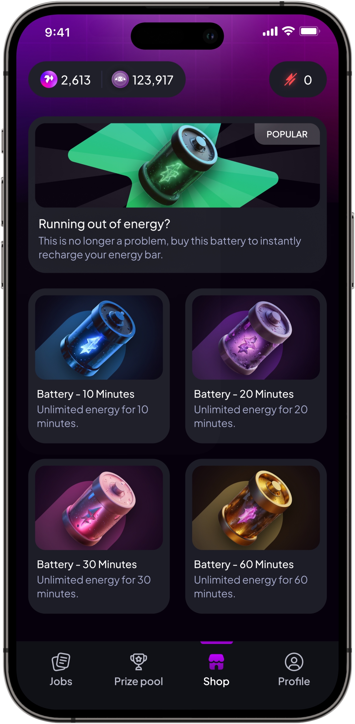 The battery item allows users to refill their energy. There are various types of batteries, ranging from less powerful to more powerful ones. This is a basic item for any user who wants to complete more tasks and improve their score, thereby increasing their rewards.