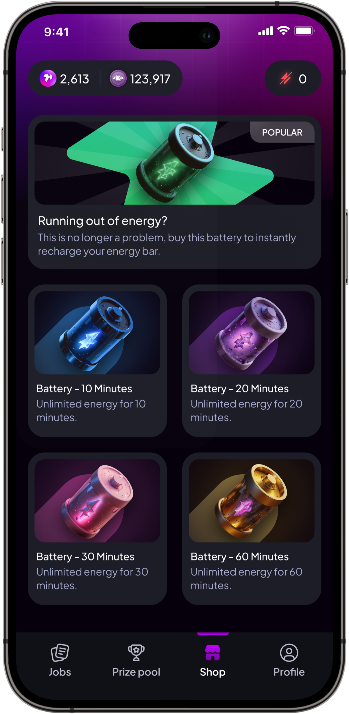 The battery item allows users to refill their energy. There are various types of batteries, ranging from less powerful to more powerful ones. This is a basic item for any user who wants to complete more tasks and improve their score, thereby increasing their rewards.