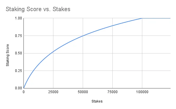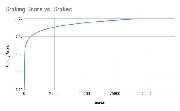 staking\_score\_i = min(\frac{\log(k \times weighted\_stake\_i + 1)}{\log(k \times \text{MAX\_STAKING} + 1)}, 1)