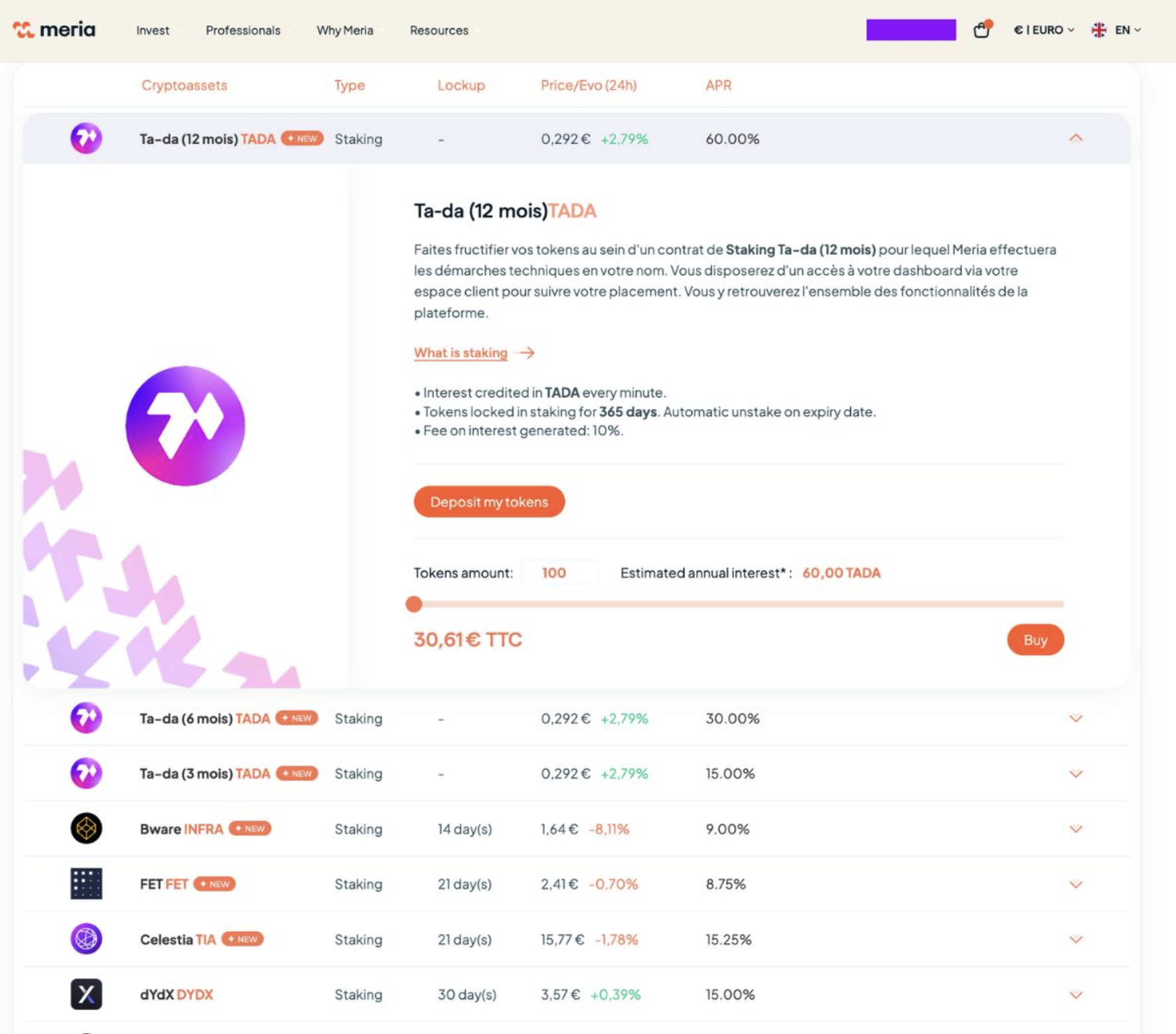 Ta-da offers a solution to stake $TADA tokens directly on Meria and benefit both staking rewards and in-game bonuses. For more details about staking rules, please visit the [rewards-and-staking](https://docs.ta-da.io/ta-da-platform/user-rewards/rewards-and-staking "mention") page.