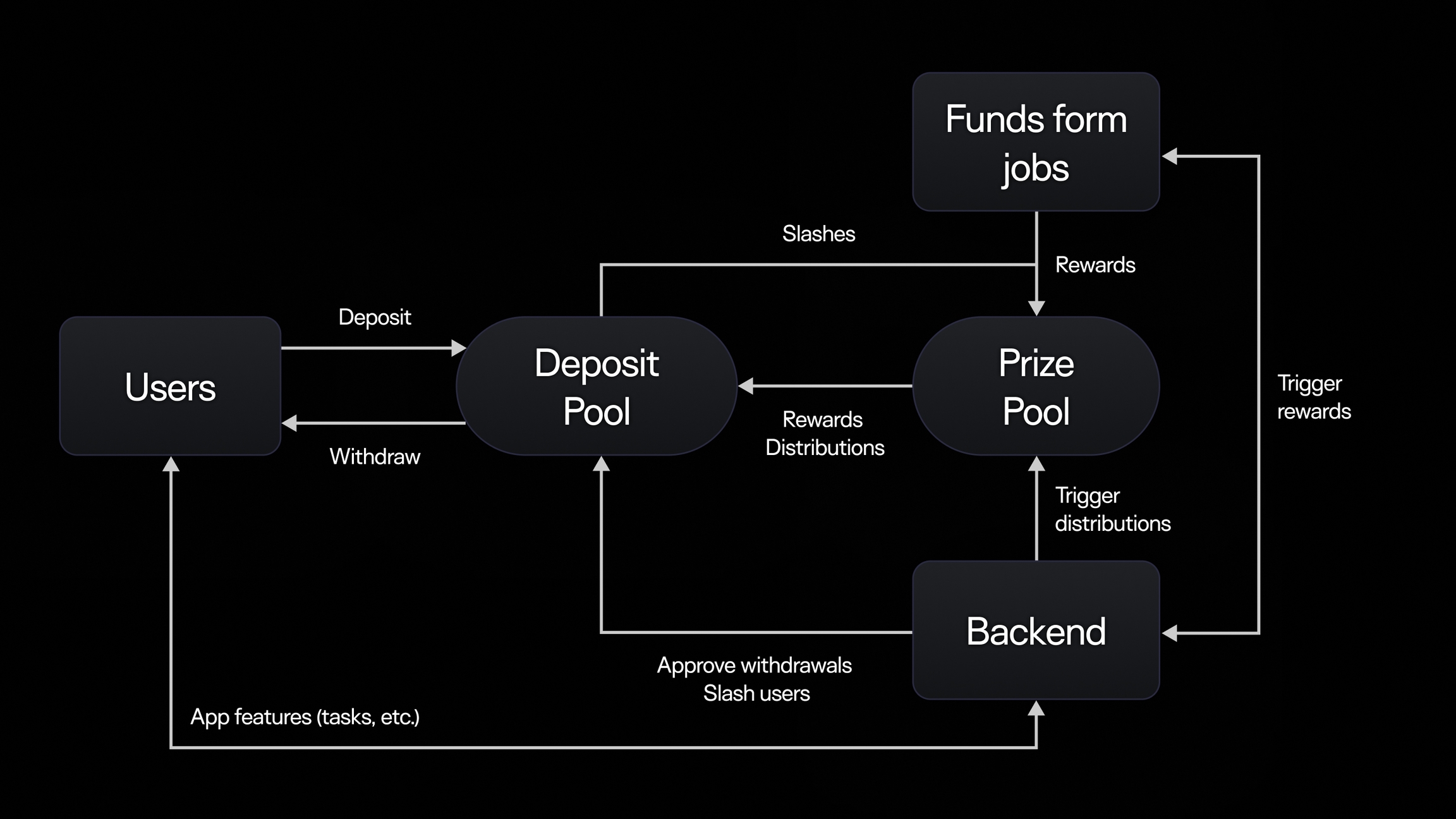 Fund management: Funds from jobs provide rewards to the Prize Pool. The backend system also approves withdrawal requests and manages the slashing and reward processes to ensure fairness.