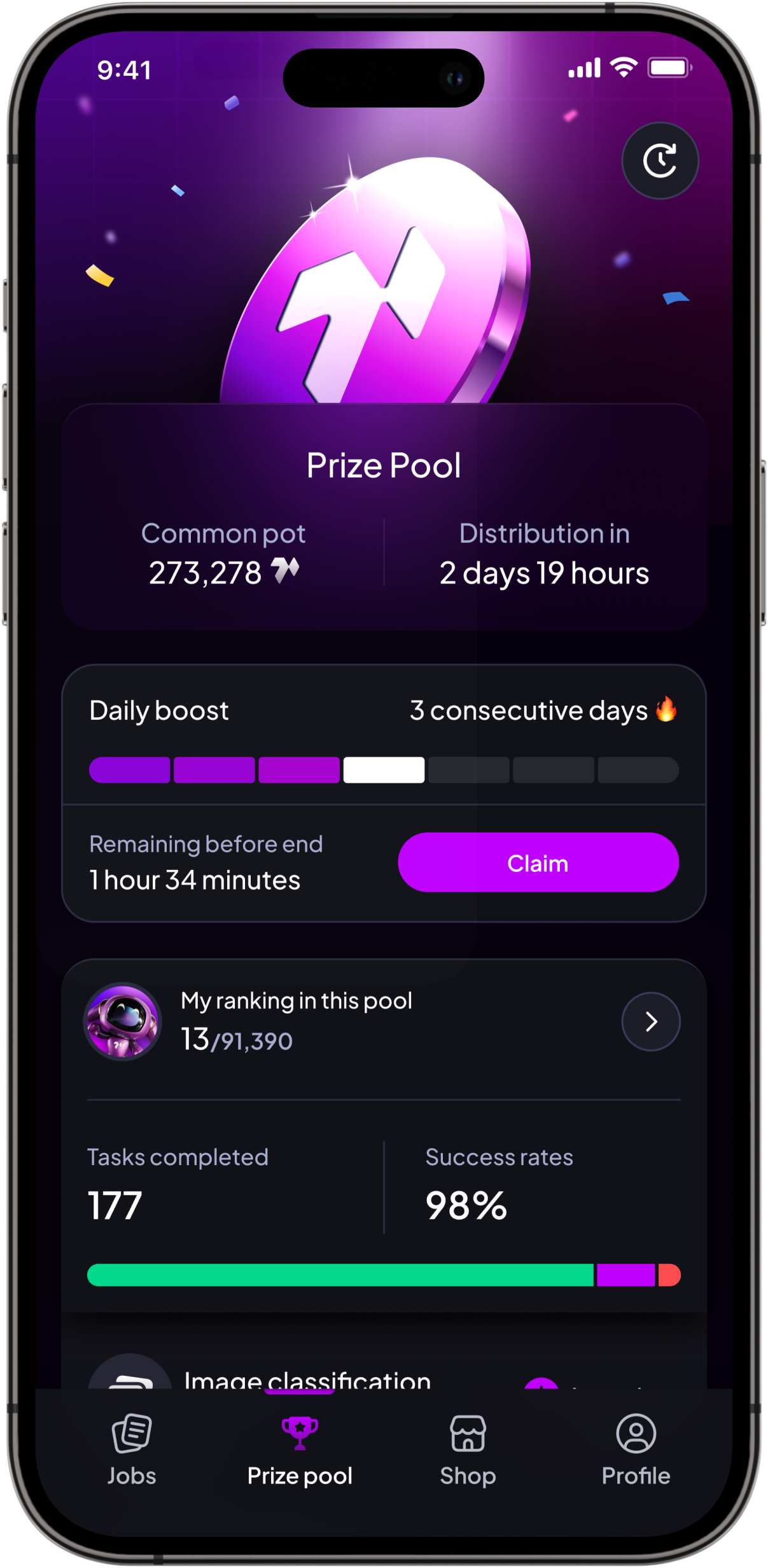 When multiple tasks are completed, the backend triggers the purchase of tokens on the market and sends them to the prize pool.